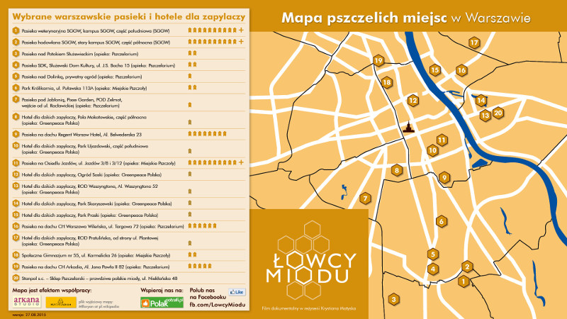 Dystrybutorem filmu Łowcy miodu jest firma Mayfly, która z powodzeniem wprowadziła na rodzimy rynek wiele filmów. Od 22 kwietnia dokument można było zobaczyć w ponad 60 kinach, w tym w kinach studyjnych oraz multipleksach. Na jesieni planowane jest wydanie DVD filmu.Mapa pszczelich miejsc w Warszawie